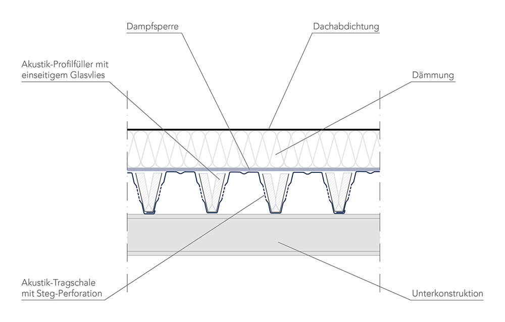 Bei der Konstruktionen als Dachaufbau mit Akustikprofilen sind die Stege der Trapezprofiltragschale gelocht. Die Lochung der Profiltafeln muss zum Zwecke der Schallabsorption mit vlieskaschierten schallabsorbierenden Mineralfaserdämmstreifen hinterlegt werden. Die Dampfsperre wird oberhalb der schallabsorbierenden Schicht auf der Tragschale angrenzend an die Wärmedämmung verlegt. Die Vorgaben der schalltechnischen Baumusterprüfungen müssen eingehalten werden.